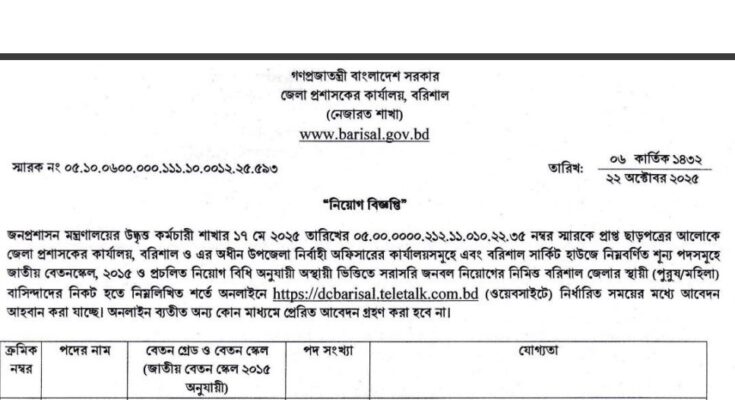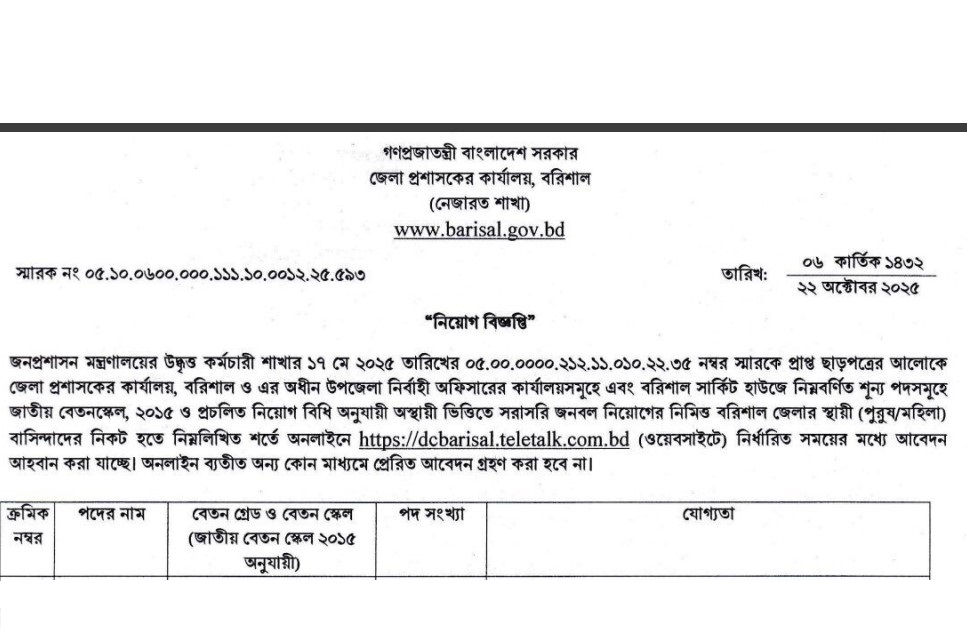 Barisal DC Office Job Circular 2025: