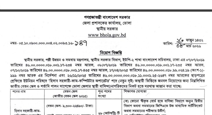 DC Office Bhola Job Circular 2026 has been published. The authority has published the Office of the Deputy Commissioner’s Bhola Job Circular 2026. Bhola DC Office Job Circular 2025 is good news for job seekers. All DC Office Bhola Accounts Assistant Cum Computer Operator Job Circular 2026 information is available below. The Deputy Commissioner’s Office of Bhola is a government organization in Bangladesh.