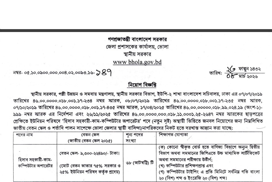 Deputy Commissioner Office Bhola Job Circular 2026:
