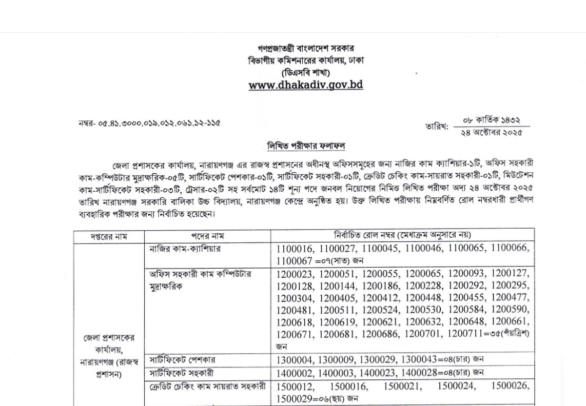 DC Office Narayanganj Exam Result 2025: