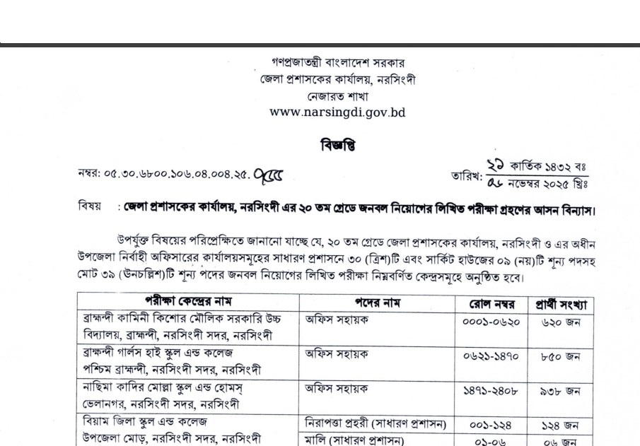 Narsingdi DC Office Exam Date and Seat Plan 2025: