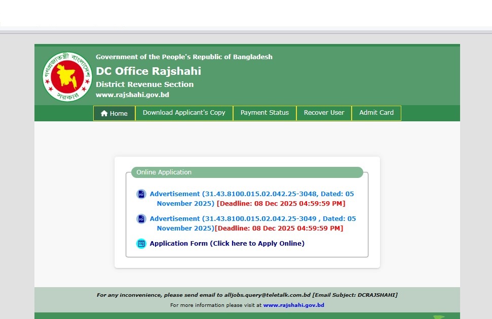 See/download Office of Deputy Commissioner Office Rajshahi Job Circular 2025, Job Apply Instructions, Job Application Form, Application Fee, Payment Process, Salary, Age, and Other Information from the images below: