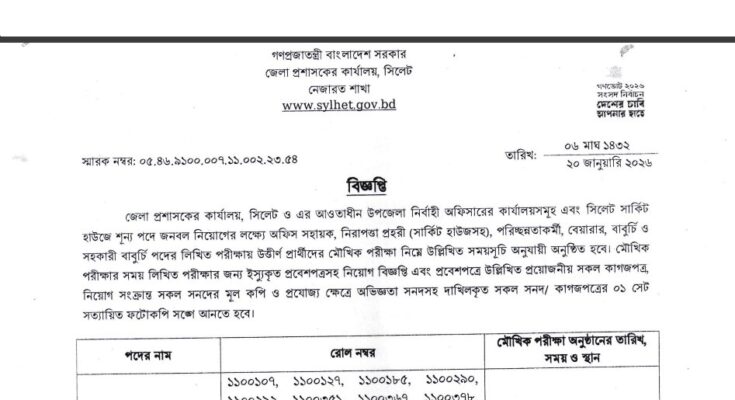 DC Office Sylhet Viva Date 2026 has been published. Office of Deputy Commissioner Sylhet Viva Date 2026 has been published by the Authority. Sylhet DC Office Viva Date 2026 is important news for job seekers in Bangladesh. All information on the Deputy Commissioner’s Office Sylhet Viva Date 2026 is available below. The District Commissioner’s Office, Sylhet, is a government organization in Bangladesh.