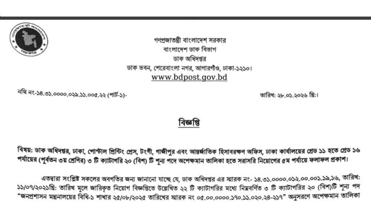 The authority has published the Director-General Post Office Panel List 2026. The Director-General of Bangladesh Post Office is one of the largest Government organizations in Bangladesh. The Director-General of the Bangladesh Post Office has published a huge job circular by the Authority. All information regarding the appointment of the Director-General, Bangladesh Post Office, is given on our website, jobstestbd.com. We publish all job circulars daily, Such as Government Jobs in Bangladesh, Bank Jobs in Bangladesh, Private Jobs in Bangladesh, International NGOs in Bangladesh, Private companies in Bangladesh, and Private University Jobs in Bangladesh. Results of Bank Jobs, Government Jobs, Government University Jobs, and Part-time Jobs in Bangladesh, as well as educational support, are available on our website. We provide different types of job information and provide some adequate information or resources and job tips that help to get a job easily. We trust that our distribution data helps job seekers who are seeking superior employment. We likewise share slanting assets for learners who are uniquely expanding their insight. Our main target is to create a trustworthy job site in Bangladesh by distributing a genuine refresh that enables individuals. All the jobs on this website are not only for unemployed people but also for employed people. All types of suggestions and solutions for the different competitive exams are available here. We provide all types of educational support on our website, jobstestbd.com. So every day, tune in to our website for all kinds of academic support. Please like our Facebook page, jobstestbd.com.