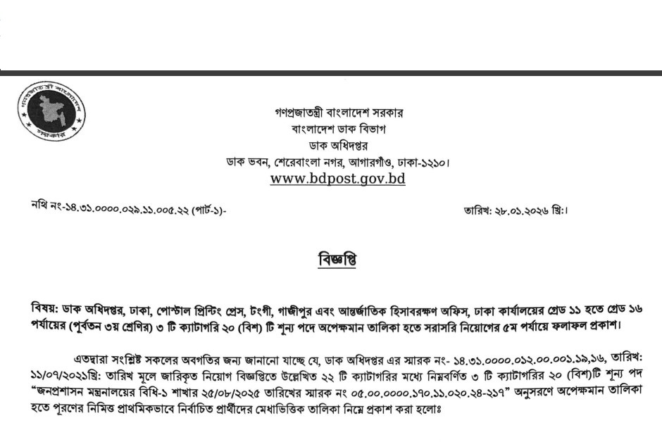 The authority has published the Director-General Post Office Panel List 2026. The Director-General of Bangladesh Post Office is one of the largest Government organizations in Bangladesh. The Director-General of the Bangladesh Post Office has published a huge job circular by the Authority. All information regarding the appointment of the Director-General, Bangladesh Post Office, is given on our website, jobstestbd.com. We publish all job circulars daily, Such as Government Jobs in Bangladesh, Bank Jobs in Bangladesh, Private Jobs in Bangladesh, International NGOs in Bangladesh, Private companies in Bangladesh, and Private University Jobs in Bangladesh. Results of Bank Jobs, Government Jobs, Government University Jobs, and Part-time Jobs in Bangladesh, as well as educational support, are available on our website. We provide different types of job information and provide some adequate information or resources and job tips that help to get a job easily. We trust that our distribution data helps job seekers who are seeking superior employment. We likewise share slanting assets for learners who are uniquely expanding their insight. Our main target is to create a trustworthy job site in Bangladesh by distributing a genuine refresh that enables individuals. All the jobs on this website are not only for unemployed people but also for employed people. All types of suggestions and solutions for the different competitive exams are available here. We provide all types of educational support on our website, jobstestbd.com. So every day, tune in to our website for all kinds of academic support. Please like our Facebook page, jobstestbd.com.