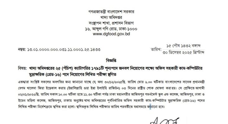 DGFood Exam Postponed Notice 2025 has been published. The authority has published the Directorate General of Food (DGFood) Written Exam Postponed Notice 2025. The Food Office Assistant Cum Computer Typist Exam Postponed Notice 2025 is good news for job seekers in Bangladesh. All information on the Food Office Assistant Cum Computer Typist WrittenExam Postponed Notice 2025 is available below. The Directorate General of Food (DGFood) is a government organization in Bangladesh.