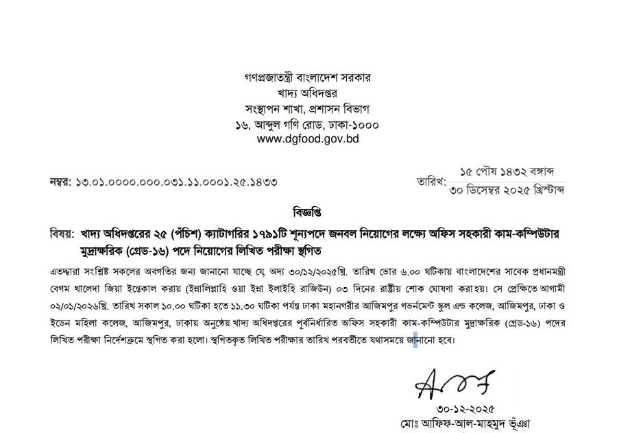 DGFood Exam Postponed Notice 2025 has been published. The authority has published the Directorate General of Food (DGFood) Written Exam Postponed Notice 2025. The Food Office Assistant Cum Computer Typist Exam Postponed Notice 2025 is good news for job seekers in Bangladesh. All information on the Food Office Assistant Cum Computer Typist WrittenExam Postponed Notice 2025 is available below. The Directorate General of Food (DGFood) is a government organization in Bangladesh.