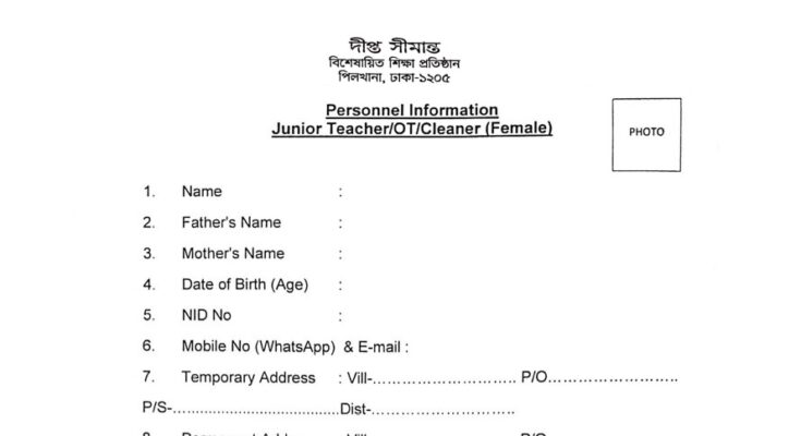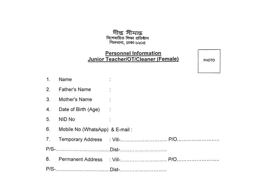 ♦ আগ্রহী প্রার্থীকে আগামী ১৫/১০/২০২৫ তারিখের মধ্যে জীবনবৃত্তান্ত, সদ্যতোলা পাসপোর্ট সাইজের ০৩ কপি রঙিন ছবি এবং সকল শিক্ষাগত ও অভিজ্ঞতার সনদপত্র সরাসরি/ডাকযোগে অধ্যক্ষ, “দীপ্ত সীমান্ত” বিশেষায়িত শিক্ষা প্রতিষ্ঠান, পিলখানা, ঢাকা এর বরাবর প্রেরণ করতে হবে। জীবনবৃত্তান্তের নমুনা Dipto Shimanto ফেইজবুক পেইজ থেকে সংগ্রহ করতে হবে।