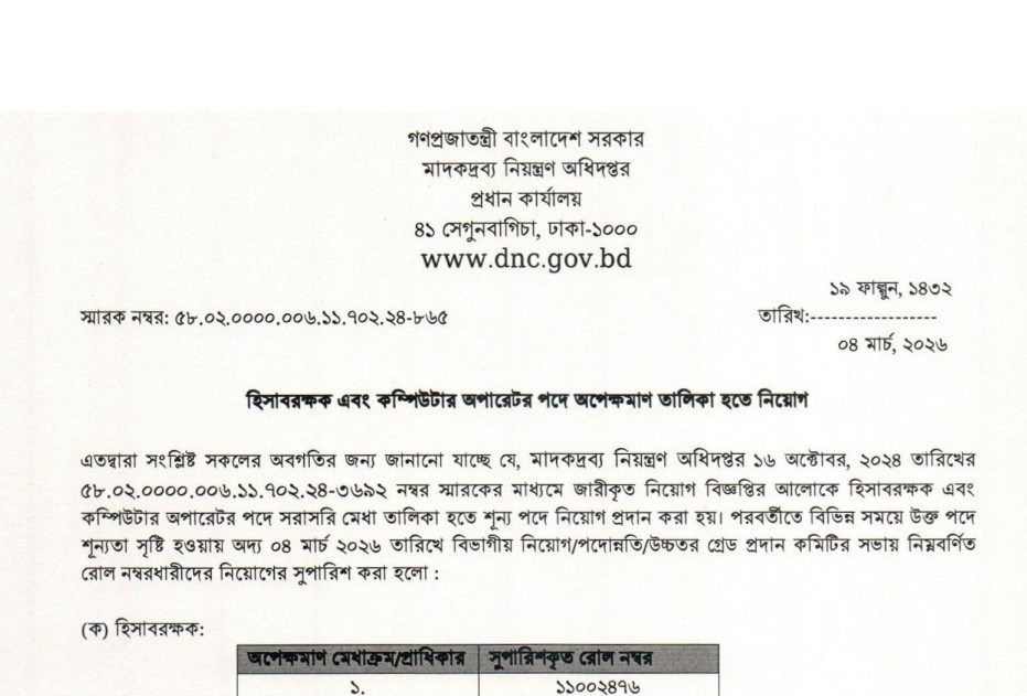 DNC Job Panel Result 2026 has been published. Department of Narcotics Control Panel Result 2026 has been published by the authority. DNC Accountant Panel Result 2026 is good news for job seekers in Bangladesh. All information on the DNC Computer Operator Job Panel Result 2026 is available below. The Department of Narcotics Control (DNC) is a Government Organization in Bangladesh.