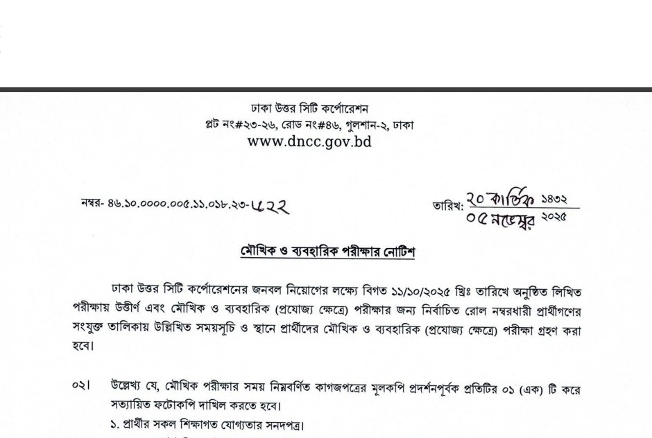 Dhaka North City Corporation (DNCC) Viva and Practical Test Date 2025 has been published. The authority has published the Dhaka North City Corporation Viva Date 2025. Dhaka North City Corporation Viva and Practical Test Date 2025 is good news for job seekers. All information on the DNCC Viva Date 2025 is available below. The Dhaka North City Corporation (DNCC) is a Government organization in Bangladesh.