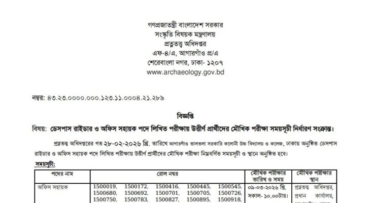 Department of Archaeology (DOA) Viva and Practical Test Date 2026 has been published. Department of Archaeology Viva Date 2026 has been published by the authority. The Archaeology Department Practical Test Date 2026 is good news for job seekers. All information on the DOA Viva and Practical Test Date 2026 is available below. The Department of Archaeology (DOA) is a Government organization in Bangladesh.