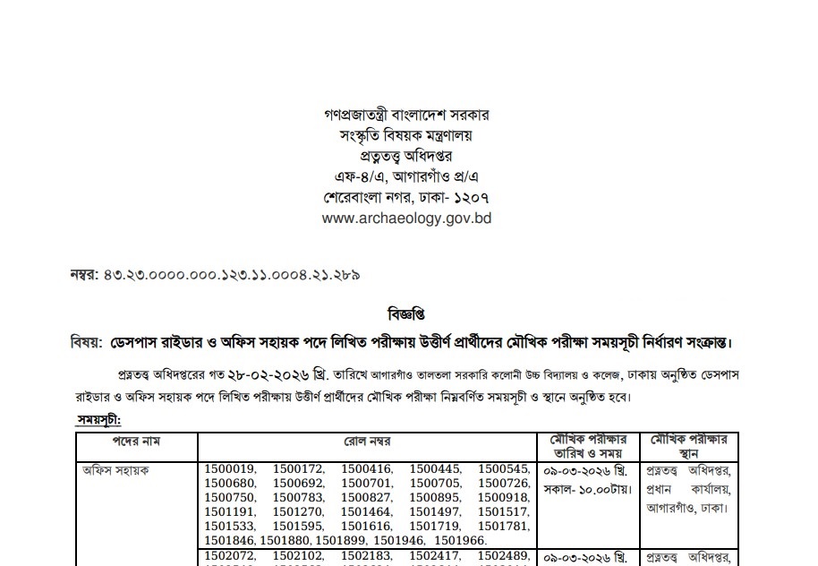 Archaeology Department Viva and Practical Test Date 2026 has been published by the authority. Department of Archaeology Job Circular information is given above. The Department of Archaeology (DOA) is one of the largest Government organizations in Bangladesh. The Department of Archaeology (DOA) Job Circular is given on our website jobstestbd.com. We publish all job circulars daily, Such as Government Jobs in Bangladesh, Bank Jobs in Bangladesh, Private Jobs in Bangladesh, International NGOs in Bangladesh, Private companies in Bangladesh, and Private University Jobs in Bangladesh. Bank Jobs Results, Government Jobs Results, Government University Jobs Results in Bangladesh, and all Part-time Jobs in Bangladesh and other educational support are available here on our website. We provide different types of job information, some effective information or resources, and job tips that help to get a job easily. We trust that our distribution of data helps the job seekers who are finding superior employment. We likewise share slanting assets for learners who are expanding their insight. Our prime target turns into a trustworthy occupation site in Bangladesh by distributing a genuine update that enables individuals to individuals. All the jobs on this website are not only for unemployed people but also for employed people. Suggestions and question solutions for the different competitive exams are available here. We offer a wide range of educational support on our website, jobstestbd.com. So every day, tune in to our website for all kinds of educational support. Please like our Facebook page, jobstestbd.com.