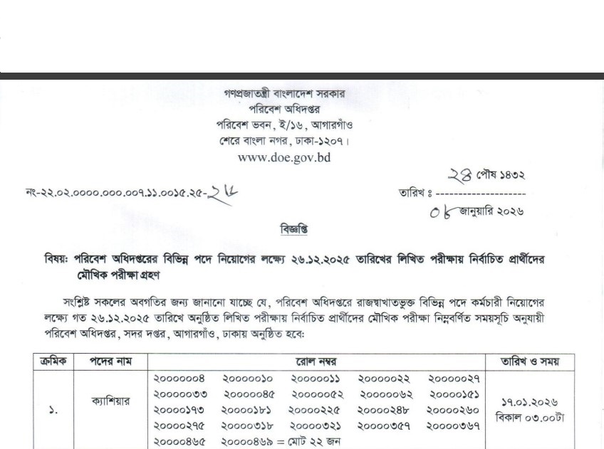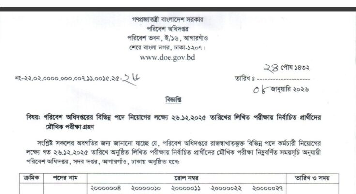 Department of Environment (DOE) Viva Date 2026 has been published. The DOE Viva Date 2026 has been published by the authority. Department of Environment Viva Date 2026 is good news for job seekers in Bangladesh. All information on the Environment Department Viva Date 2026 is available below. The Department of Environment (DOE) is a Government Organization in Bangladesh.