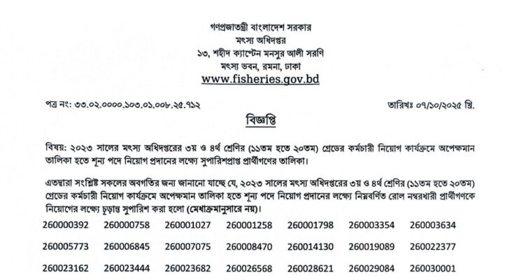 Department of Fisheries (DOF) Panel Result 2025 has been published. The authority has published the DOF Panel Result 2025. The Fisheries Department Panel Result 2025 is good news for job seekers. All information on the DOF Panel Result List 2025 is available below. The Department of Fisheries (DOF) is a government organization in Bangladesh.