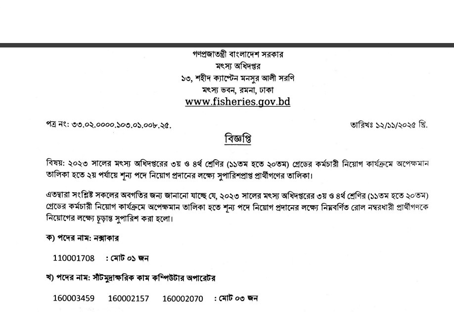 The authority has published the Department of Fisheries Job Panel Result Notice 2025. Department of Fisheries (DOF) Job Circular information is given above. The Department of Fisheries (DOF) is one of the largest Government organizations in Bangladesh. The Department of Fisheries (DOF) Job Circular is given on our website jobstestbd.com. We publish all job circulars daily, Such as Government Jobs in Bangladesh, Bank Jobs in Bangladesh, Private Jobs in Bangladesh, International NGOs in Bangladesh, Private companies in Bangladesh, and Private University Jobs in Bangladesh. Bank Jobs Results, Government Jobs Results, Government University Jobs Results in Bangladesh, and all Part-time Jobs in Bangladesh and other educational support are available here on our website. We provide different types of job information, with also provide some effective information or resources and job tips which help to get a job easily. We trust that our distribution data helps job seekers who are finding superior employment. We likewise share slanting assets for learners who are expanding their insight. Our prime target turns into a trustworthy occupation round site in Bangladesh by distributing a genuine update that enables individuals. All the jobs on this website are not only for unemployed people but also for employed people. All types of suggestions and question solutions for the different competitive exams are available here. We provide all types of educational support on our website, jobstestbd.com. So every day, tune in to our website for all kinds of educational support. Please like our Facebook page, jobstestbd.com.