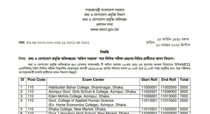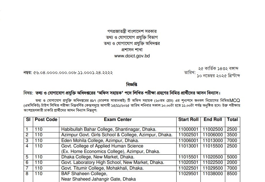 Department of ICT (DOICT) Office Sohayok MCQ Exam Seat Plan 2025
