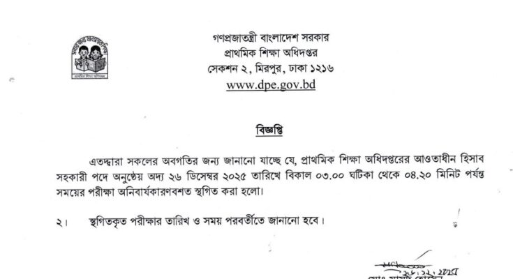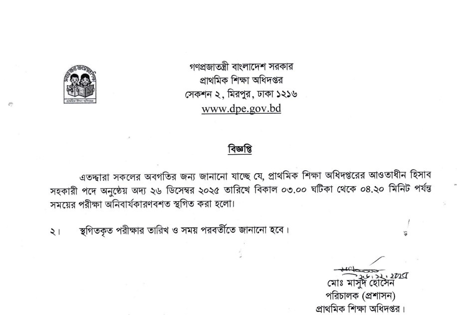 অনিবার্য কারণবশত আজ (২৬ ডিসেম্বির ২০২৫) অনুষ্ঠিতব্য প্রাথমিক শিক্ষা অধিদপ্তরের আওতাধীন হিসাব সহকারী পদের পরীক্ষা স্থগিত করা হয়েছে।
