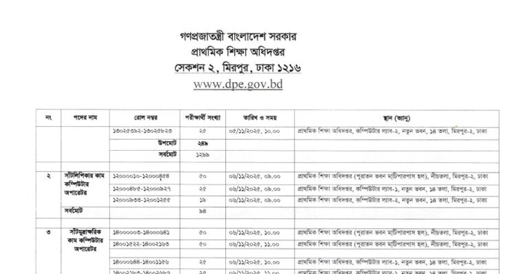 Directorate of Primary Education DPE Job Practical Test Date 2025: