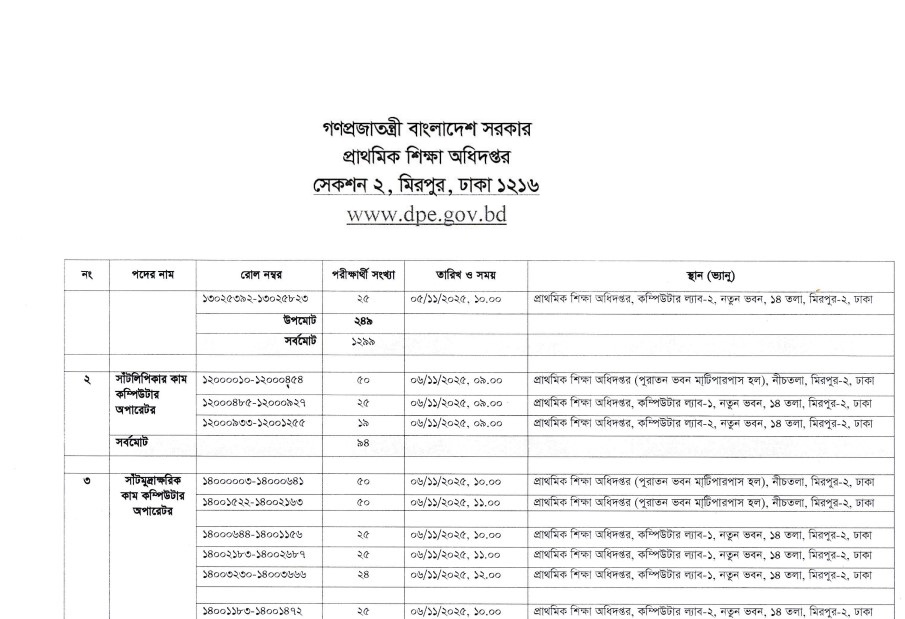 Directorate of Primary Education DPE Job Practical Test Date 2025: