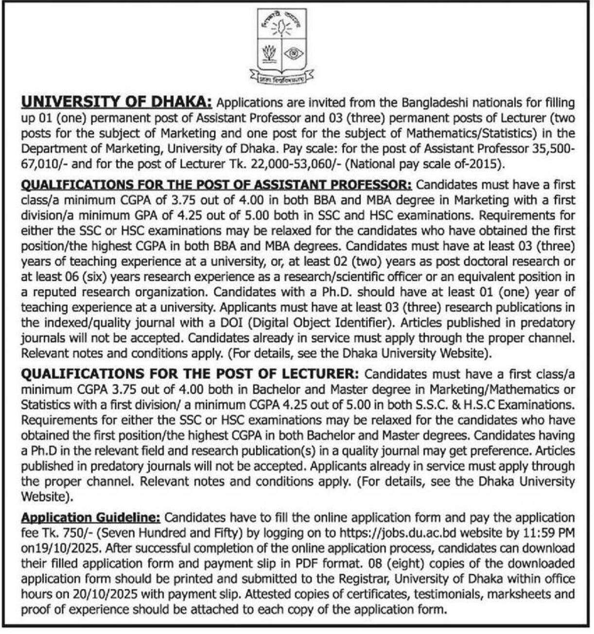 See/download Dhaka University Job Circular 2025, Job Apply Instruction, Job Application Form, Application Fee, Payment Process, Salary, Age, and Other Information from the images below: