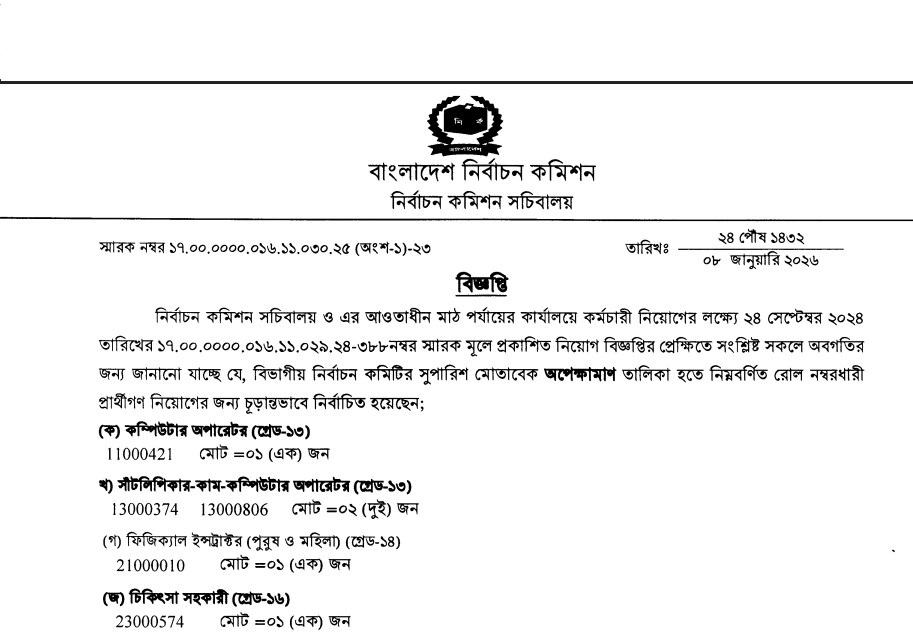 Bangladesh Election Commission Panel Result 2026 is available above. Bangladesh Election Commission (ECS) has been published by the authority. Bangladesh Election Commission (ECS) Job Circular information is given above. Bangladesh Election Commission (ECS) is one of the largest Government organizations in Bangladesh. The Election Commission (ECS) has published a huge job circular. All information regarding the appointment of the Bangladesh Election Commission (ECS) is given on our website, jobstestbd.com. We publish all job circulars daily, including government jobs in Bangladesh, Bank Jobs in Bangladesh, Private Jobs in Bangladesh, International NGOs in Bangladesh, Private companies in Bangladesh, and Private University Jobs in Bangladesh. Bank Jobs Results, Government Jobs Results, Government University Jobs Results in Bangladesh, and all Part-time Jobs in Bangladesh and other educational support are available here on our website. We provide different types of job information, including some effective information or resources and job tips, which help to get a job easily. We trust that our distributed data helps job seekers who are looking for better employment. We likewise share slanting assets for learners who are expanding their insight. Our main target turn into a trustworthy job site in Bangladesh by distributing a genuine refresh that enables opportunities for individuals. All the jobs on this website are not only for unemployed people but also for employed people. Suggestions and question solutions for the different competitive exams are available here. We provide all types of educational support on our website, jobstestbd.com. So every day, visit our website for all kinds of academic support. Please like our Facebook page, jobstestbd.com.