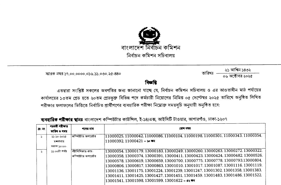 Bangladesh Election Commission Practical Test Date 2025 is available above. Bangladesh Election Commission (ECS) has been published by the authority. Bangladesh Election Commission (ECS) Job Circular information is given above. Bangladesh Election Commission (ECS) is one of the largest Government organizations in Bangladesh. The Election Commission (ECS) has published a huge job circular. All information regarding the appointment of the Bangladesh Election Commission (ECS) is given on our website, jobstestbd.com. We publish all job circulars daily, including government jobs in Bangladesh, Bank Jobs in Bangladesh, Private Jobs in Bangladesh, International NGOs in Bangladesh, Private companies in Bangladesh, and Private University Jobs in Bangladesh. Bank Jobs Results, Government Jobs Results, Government University Jobs Results in Bangladesh, and all Part-time Jobs in Bangladesh and other educational support are available here on our website. We provide different types of job information, with as provide some effective information or resources and job tips, which help to get a job easily. We trust that our distributed data helps job seekers who are looking for better employment. We likewise share slanting assets for learners who are expanding their insight. Our main target turn into a trustworthy job site in Bangladesh by distributing a genuine refresh that enables opportunities for individuals. All the jobs on this website are not only for unemployed people but also for employed people. Suggestions and question solutions for the different competitive exams are available here. We provide all types of educational support on our website, jobstestbd.com. So every day, visit our website for all kinds of academic support. Please like our Facebook page, jobstestbd.com.