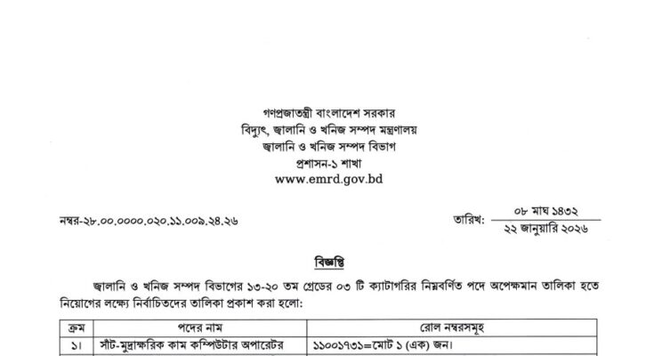 Energy and Mineral Resources Division (EMRD) Panel Result 2026 has been published. EMRD Office Assistant Cum Computer Operator Panel Result 2026 has been published by the Authority. The Energy and Mineral Resources Division Panel Result 2026 is important news for job seekers in Bangladesh. All information on the EMRD Office Sohayok Panel Result 2026 is available below. The Energy and Mineral Resources Division (EMRD) is a Government Organization in Bangladesh.