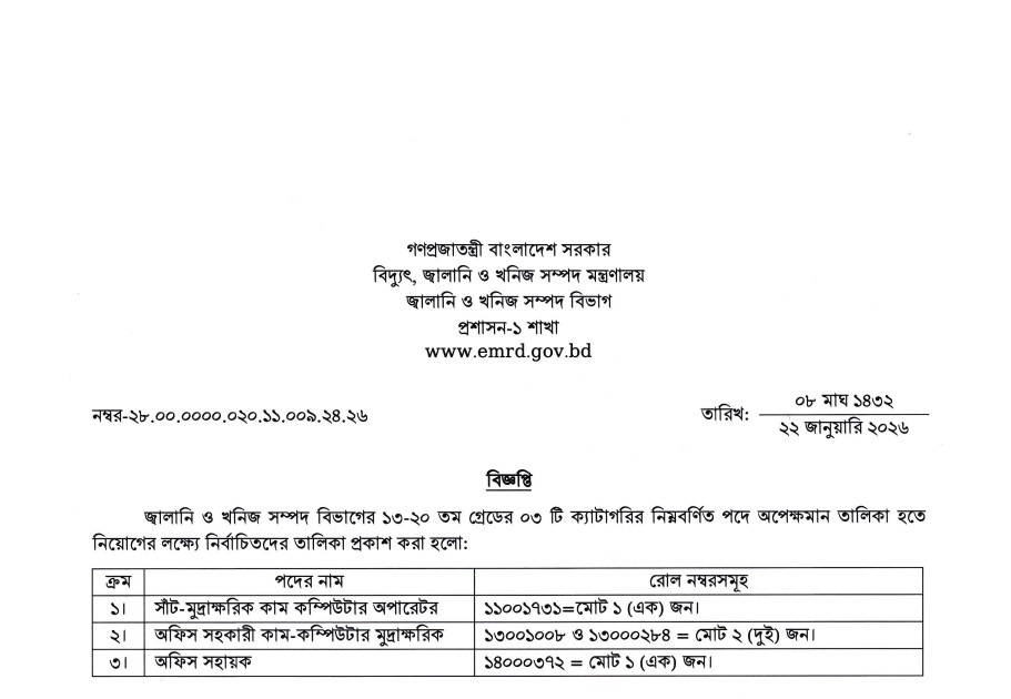 Energy and Mineral Resources Division (EMRD) Panel Result 2026 has been published. EMRD Office Assistant Cum Computer Operator Panel Result 2026 has been published by the Authority. The Energy and Mineral Resources Division Panel Result 2026 is important news for job seekers in Bangladesh. All information on the EMRD Office Sohayok Panel Result 2026 is available below. The Energy and Mineral Resources Division (EMRD) is a Government Organization in Bangladesh.