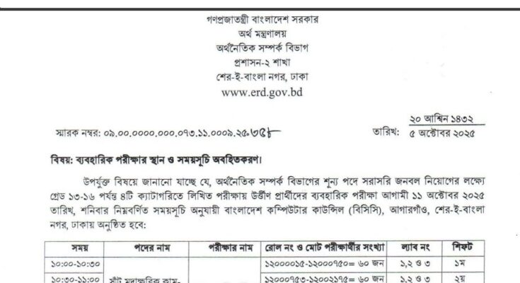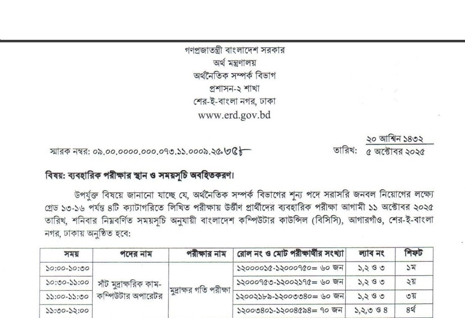 Economic Relations Division (ERD) Practical Test Date 2025 has been published. The authority has published the ERD Practical Test Date 2025. Economic Relations Division Practical Test Date 2025 is good news for the students. All information on the ERD Steno Typist Cum Computer Operator Practical Test Date 2025 is available below. The Economic Relations Division (ERD) is a government organization in Bangladesh.
