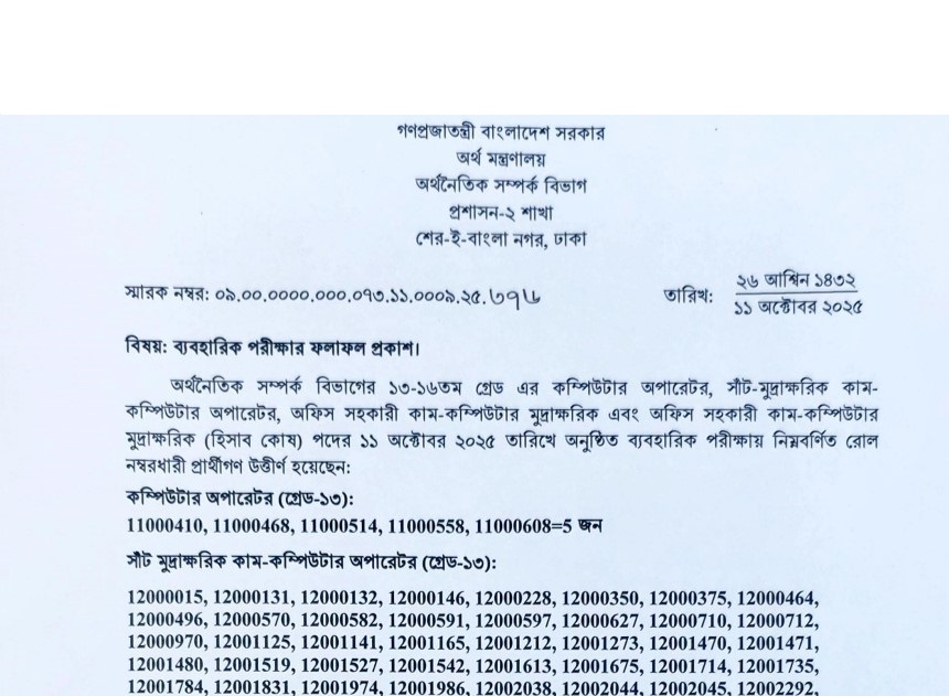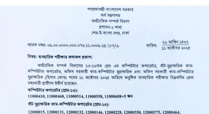 Economic Relations Division (ERD) Practical Test Result 2025 has been published. The authority has published the ERD Practical Test Result 2025. Economic Relations Division Practical Test Result 2025 is good news for the students. All information on the ERD Steno Typist Cum Computer Operator Practical Test Result 2025 is available below. The Economic Relations Division (ERD) is a government organization in Bangladesh.