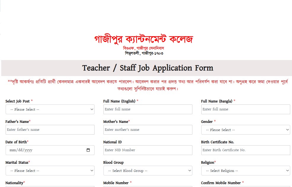 ১। আবদনের নিয়মাবলী: আগ্রহী প্রার্থীগণকে গাজীপুর ক্যান্টনমেন্ট কলেজের website: https://gccbof.edu.bd/contents/careers থেকে অনলাইনে আবেদন ফর্ম পূরণ করে এবং TAP অ্যাপের মাধ্যমে নির্ধারিত আবেদন ফি ৭০০/- (সাতশত) টাকা পরিশোধ করে পেমেন্টের রশিদ আবেদন পত্রের সাথে জমা দিতে হবে।