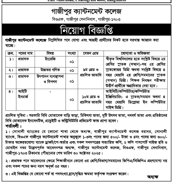See/download Gazipur Cantonment College Job Circular 2025, Job Apply Instructions, Job Application Form, Application Fee, Payment Process, Salary, Age, and Other Information from the image below: