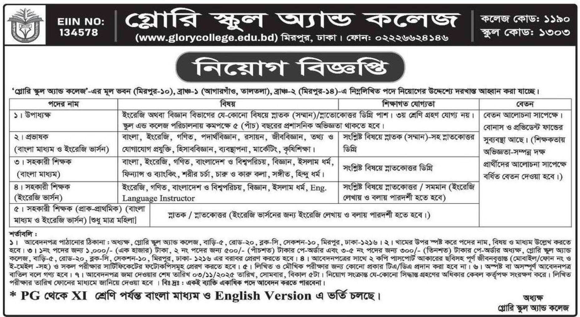 See/download Glory School and College Job Circular, Job Apply Instructions, Job Application Form, Application Fee, Payment Process, Salary, Age, and Other Information from the image below:
