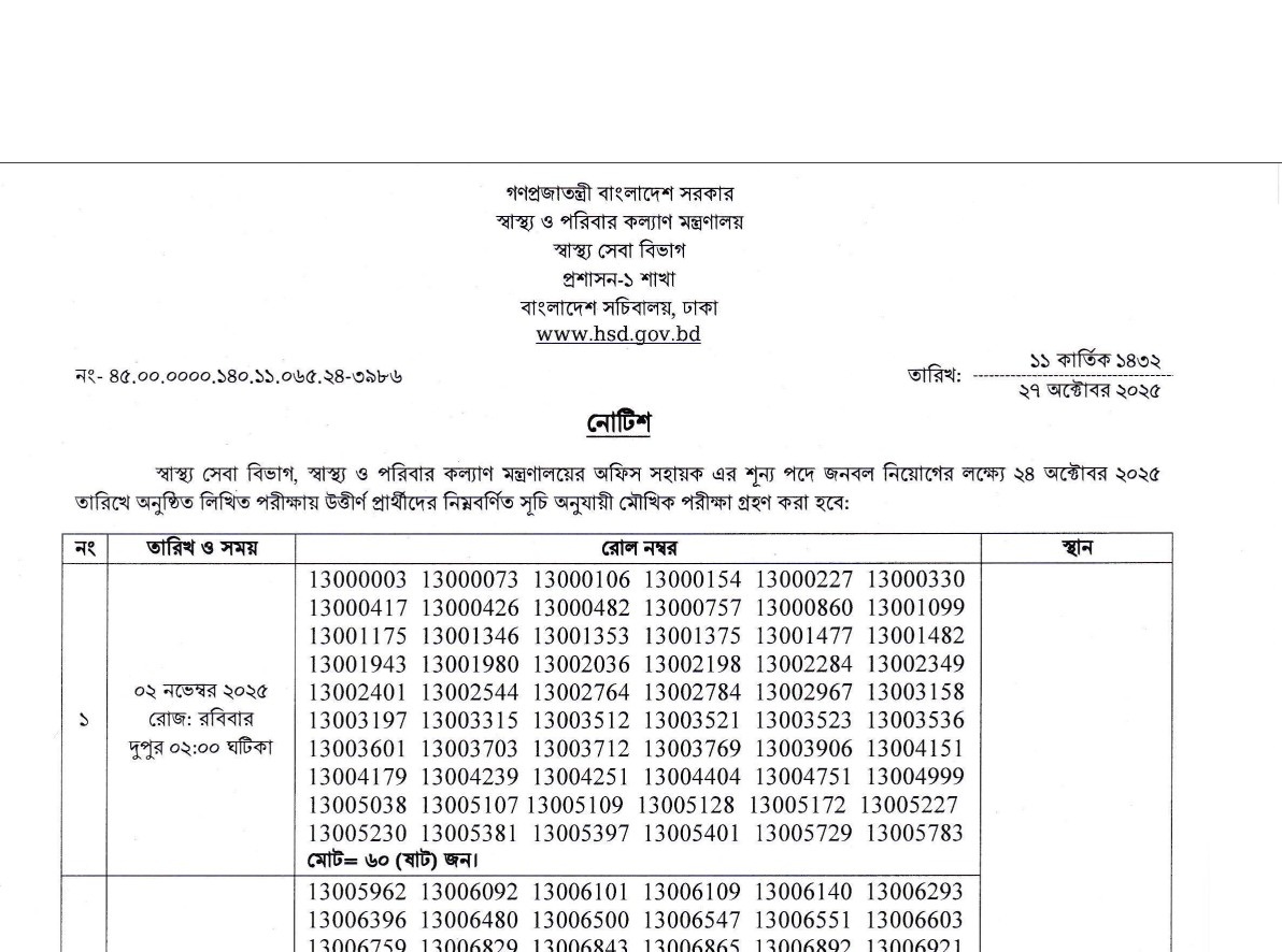 Health Services Division (HSD) Viva Date 2025 has been published. The authority has published the HSD Viva Date 2025. The Health Services Division Viva Date 2025 is good news for job seekers in Bangladesh. All information on the HSD Office Sohayok Viva Date 2025 is available below. Health Services Division (HSD) is a government organization in Bangladesh.
