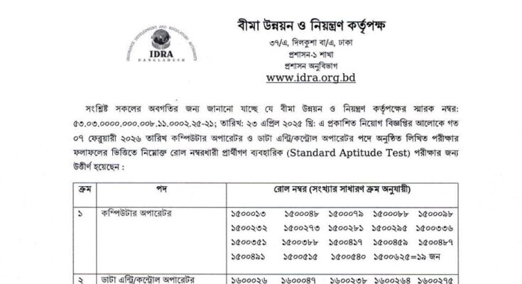 IDRA Exam Result 2026 has been published. Insurance Development and Regulatory Authority Exam Result 2026 has been published by the authority. IDRA Computer Operator Exam Result 2026 is good news for job seekers in Bangladesh. All information on the IDRA Data Entry Operator Exam Result 2026 is available below. The Insurance Development and Regulatory Authority  (IDRA) is a Government Organization in Bangladesh.