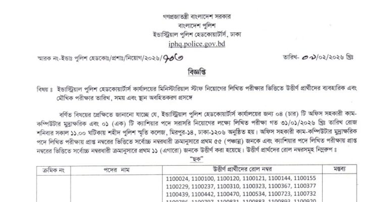 Industrial Police Headquarters (IPHQ) Exam Result 2026 has been published. The IPHQ Exam Result 2026 has been published by the authority. The Industrial Police Headquarters Cashier Exam Result 2026 is good news for job seekers. All information on the Industrial Police Exam Result 2026 is available below. The Industrial Police Headquarters (IPHQ) is a Government organization in Bangladesh.
