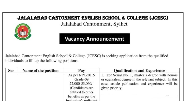 Jalalabad Cantonment English School and College (JCESC) Job Circular 2025 has been published. The JCESC Job Circular 2025 has been published by the authority. Jalalabad Cantonment English School and College Job Circular 2025 is good news for job seekers. All information on the Jalalabad Cantonment English School and College Sylhet Job Circular 2025 is available below. Jalalabad Cantonment English School and College (JCESC) is a Government organization in Bangladesh.