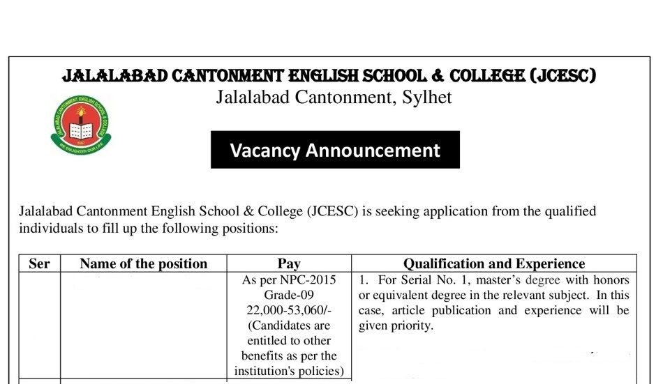 Jalalabad Cantonment English School and College (JCESC) Job Circular 2025 has been published. The JCESC Job Circular 2025 has been published by the authority. Jalalabad Cantonment English School and College Job Circular 2025 is good news for job seekers. All information on the Jalalabad Cantonment English School and College Sylhet Job Circular 2025 is available below. Jalalabad Cantonment English School and College (JCESC) is a Government organization in Bangladesh.