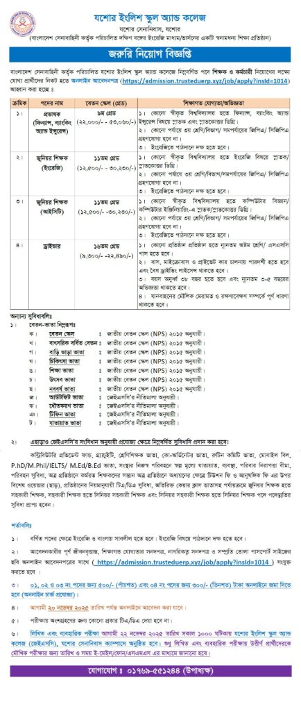 See/download Jashore English School and College Job Circular 2025, Job Application Form, Job Apply Instructions, Application Fee, Payment Process, Salary, Age, and Other Information from the image below: