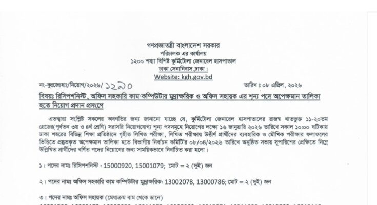Kurmitola General Hospital (KGH) Job Panel Result 2026 has been published. The authority has published the KGH Panel Result 2026. The Kurmitola General Hospital Job Panel Result Notice 2026 is good news for the students. All information on the Kurmitola General Hospital Job Panel Result List 2026 is available below. Kurmitola General Hospital (KGH) is a government organization in Bangladesh.
