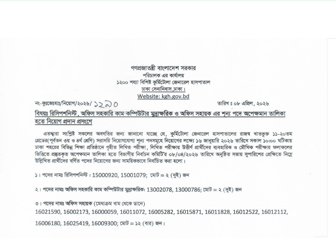 Kurmitola General Hospital (KGH) Job Panel Result 2026