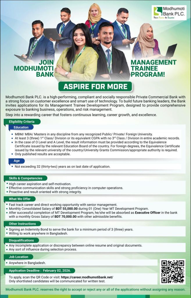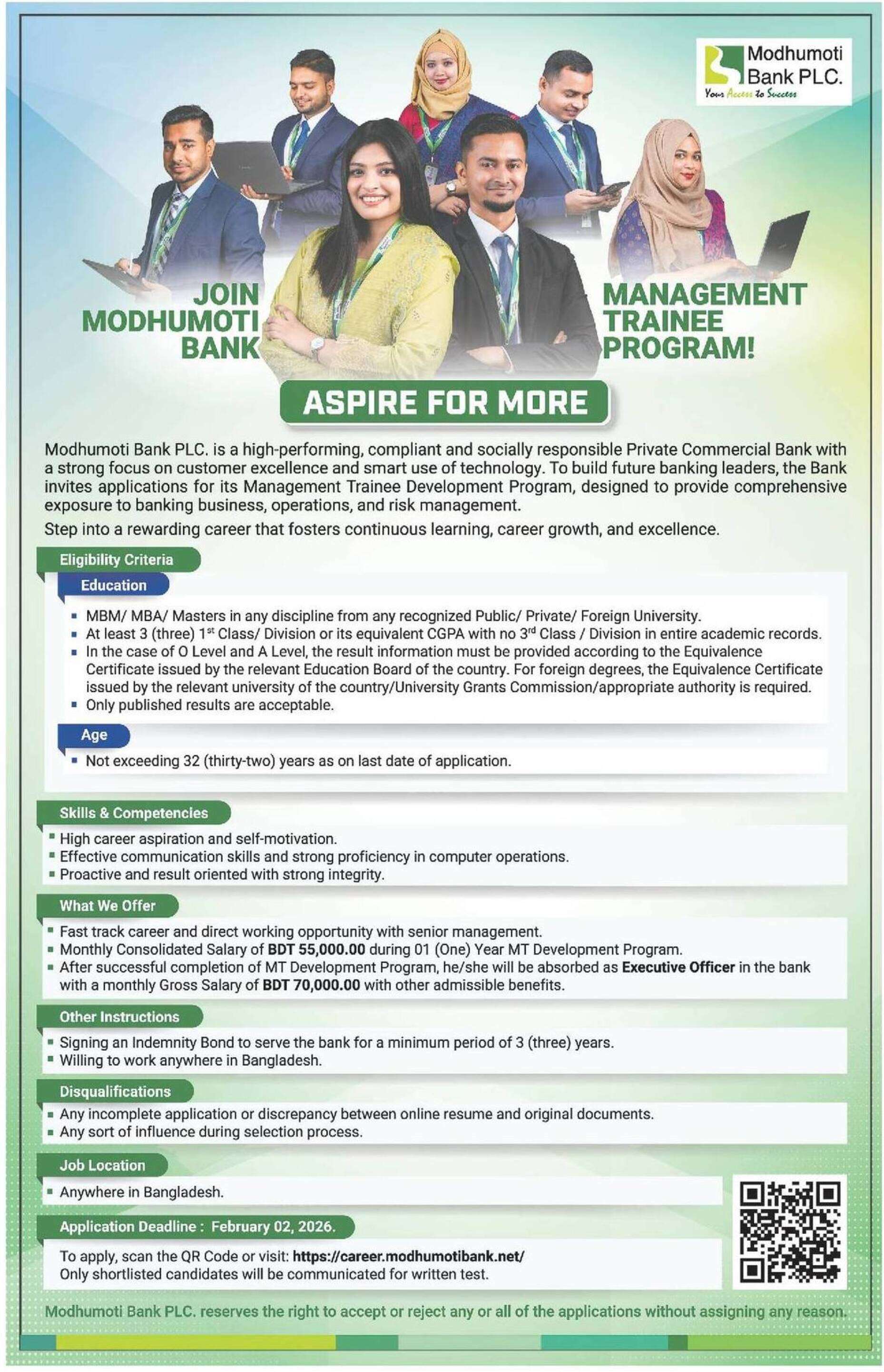 Modhumoti Bank PLC Management Trainee Job Circular 2026 has been published today. The authority has published the MMBL MTO Job Circular 2026. The Modhumoti Bank Management Trainee Program Job Circular 2026 is good news for job seekers in Bangladesh. All information on the Modhumoti Bank Management Trainee Officer Job Circular 2026 is available below. Modhumoti Bank PLC is a renowned private organization in Bangladesh.