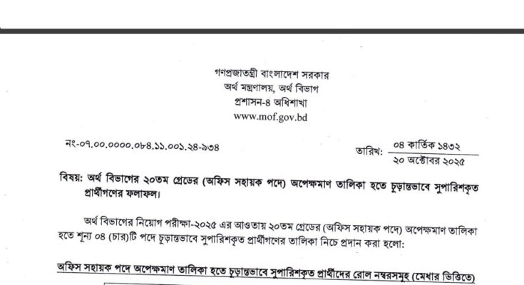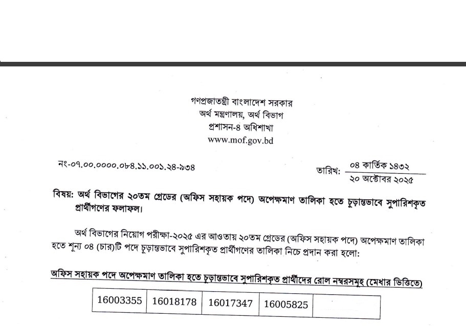 Ministry of Finance (MOF) Panel Result 2025 has been published. The authority has published the MOF Panel Result 2025. Finance Ministry Job Panel Result 2025 is good news for job seekers. All information on the Ministry of Finance Office Sohayok Panel Result 2025 is available below. The Ministry of Finance (MOF) is a Government organization in Bangladesh.