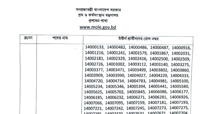 Ministry of Labour and Employment (MOLE) Exam Result 2026 has been published. The authority has published the MOLE Exam Result 2026. The Ministry of Labour and Employment Exam Result 2026 is good news for job seekers. All information on the Ministry of Labour and Employment Office Sohayok Exam Result 2026 is available below. The Ministry of Labour and Employment (MOLE) is a Government organization in Bangladesh.