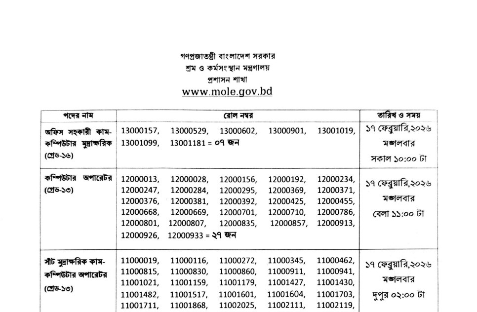 Ministry of Labour and Employment (MOLE) Viva Date 2026 has been published. The authority has published the MOLE Viva Date 2026. The Ministry of Labour and Employment Viva Date 2026 is good news for job seekers. All information on the Ministry of Labour and Employment Steno Typist Cum Computer Operator Viva Date 2026 is available below. The Ministry of Labour and Employment (MOLE) is a Government organization in Bangladesh.