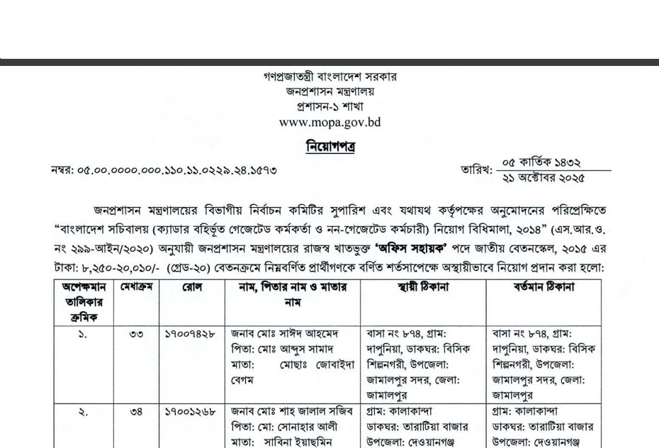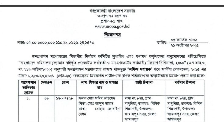 MOPA Job Panel Result 2025 has been published. The Authority has published the Ministry of Public Administration (MOPA) Panel Result 2025. MOPA Office Sohayok Panel Result 2025 is great news for job seekers in Bangladesh. All information on the MOPA Steno Typist Cum Computer Operator Panel Result 2025 is available below. The Ministry of Public Administration (MOPA) is a Government Organization in Bangladesh.
