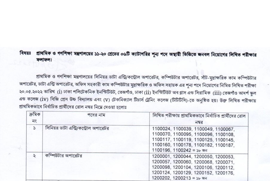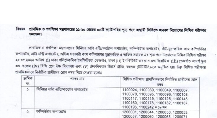 MOPME Exam Result 2022 has been published. Ministry of Primary and Mass Education Exam Result 2022 has been published by the authority. Ministry of Primary and Mass Education (MOPME) Exam Result 2022 is good news for job seekers. All information on the Ministry of Primary and Mass Education Computer Operator Written Exam Result 2022 is available below. The Ministry of Primary and Mass Education (MOPME) is a Government organization in Bangladesh.