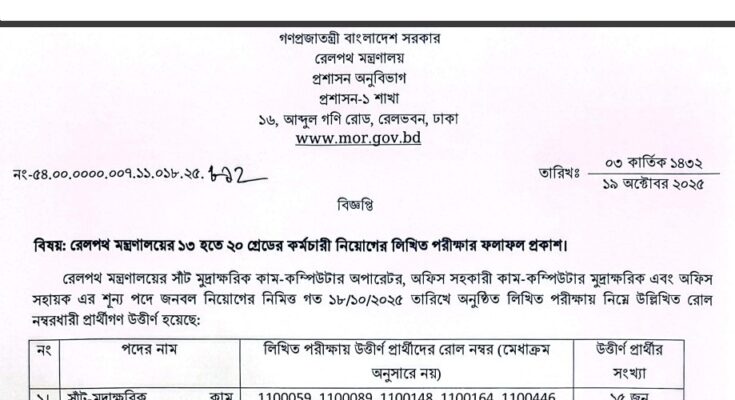 Ministry of Railways (MOR) Exam Result 2025 has been published. The authority has published the MOR Exam Result 2025. The Ministry of Railways Exam Result 2025 is good news for job seekers in Bangladesh. All information on the Railways Ministry Exam Result 2025 is available below. The Ministry of Railways (MOR) is a Government Organization in Bangladesh.