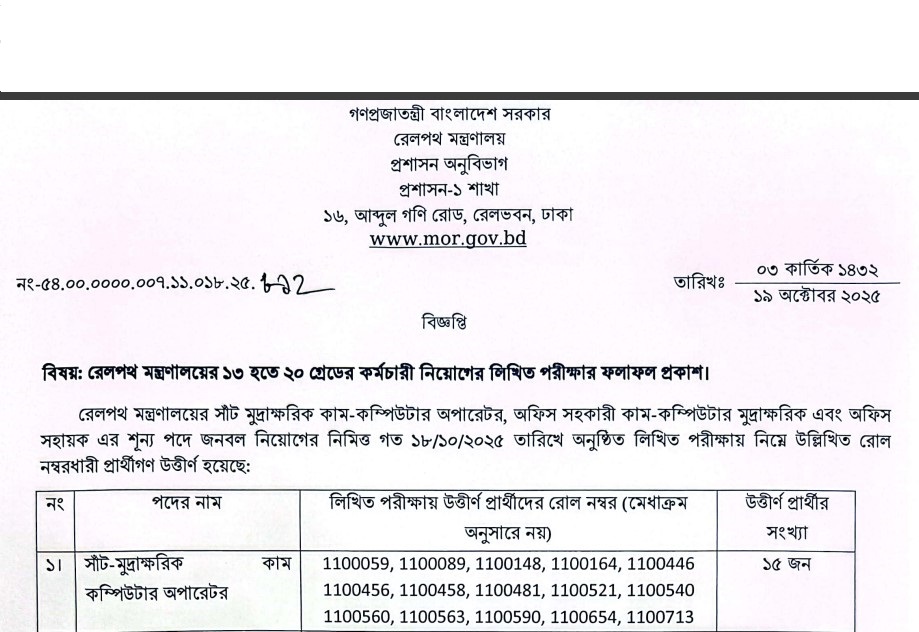 Ministry of Railways (MOR) Exam Result 2025 has been published. The authority has published the MOR Exam Result 2025. The Ministry of Railways Exam Result 2025 is good news for job seekers in Bangladesh. All information on the Railways Ministry Exam Result 2025 is available below. The Ministry of Railways (MOR) is a Government Organization in Bangladesh.