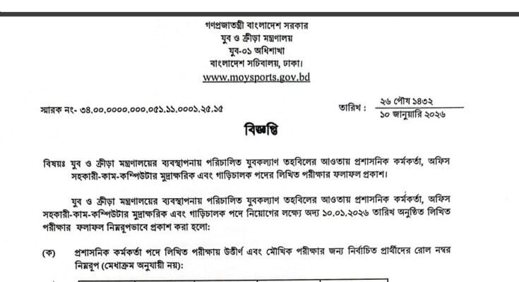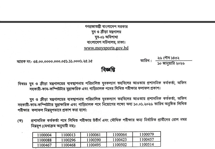 Ministry of Youth and Sports Job Exam Result 2026 has been published by the authority. The Ministry of Youth and Sports is one of the Government organizations in Bangladesh. The Ministry of Youth and Sports has published a huge job circular by the Authority. All information regarding the Ministry of Youth and Sports appointment is given on our website, jobstestbd.com. We publish all job circulars every day, Such as Government Jobs in Bangladesh, Bank Jobs in Bangladesh, Private Jobs in Bangladesh, International NGOs in Bangladesh, Private companies in Bangladesh, and Private University Jobs in Bangladesh. Bank Jobs Results, Government Jobs Results, Government University Jobs Results in Bangladesh, and all Part-time Jobs in Bangladesh and other educational support are available here on our website. We provide different types of job information, some effective information or resources, and job tips that help to get a job easily. We trust that our distribution data helps job seekers who are looking for better employment. We likewise share slanting assets for learners who are expanding their insight. Our main target turn into a trustworthy job site in Bangladesh by distributing a genuine refresh that enables opportunities to individuals. All the jobs on this website are not only for unemployed people but also for employed people. All types of suggestions and question solutions for the different competitive exams are available here. We provide all types of educational support on our website, jobstestbd.com. So every day, tune in to our website for all kinds of academic support. Please like our Facebook page, jobstestbd.com.